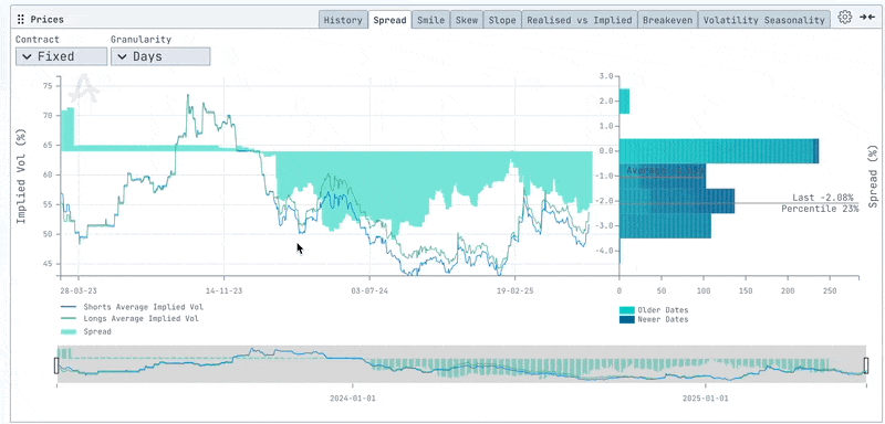 This chart visualizes the spread between the implied volatility (IV) of the long and short legs of an options structure. It offers valuable insights into relative pricing, market sentiment, and trading opportunities across different contract. It displays IV for both long and short legs in an option structure and calculates the spread between them as a histogram.