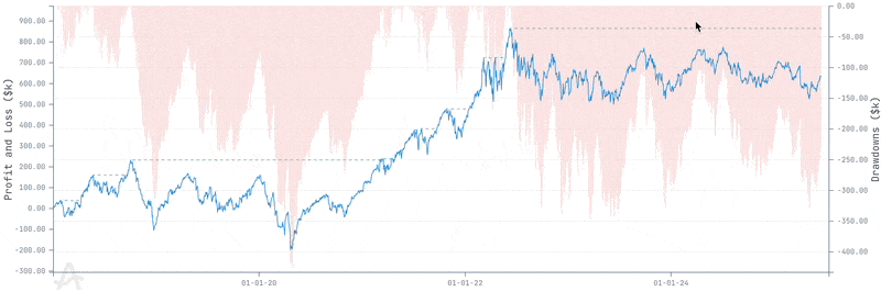 - Y-axis: Drawdown in dollars (k$) from previous equity peaks.