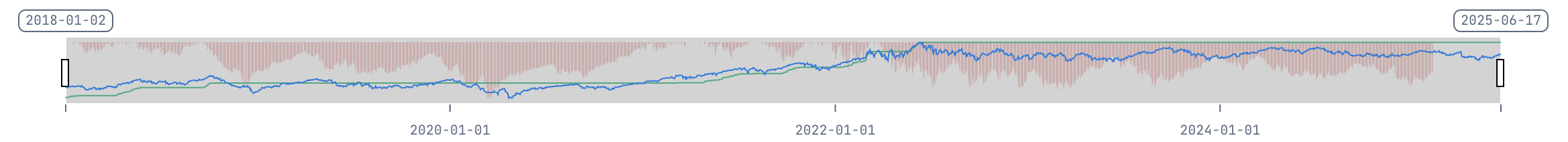 - Red Area: Drawdown periods from historical equity peaks.