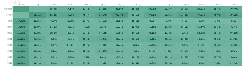 - Rows: Each calendar year (including total and average rows).