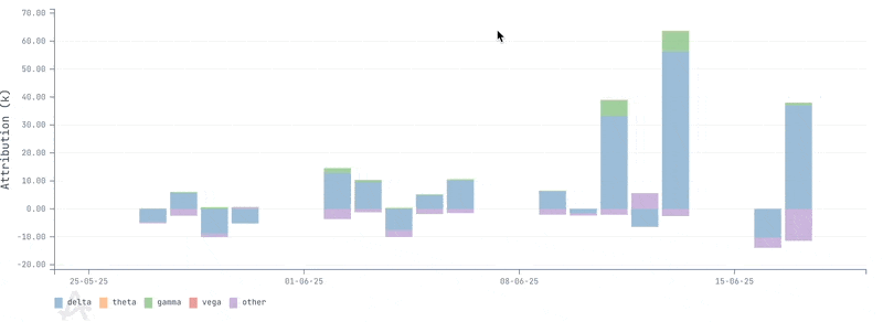- Isolate drivers: Look for days when a specific Greek dominates the attribution β this can signal structural exposure or unexpected behavior.