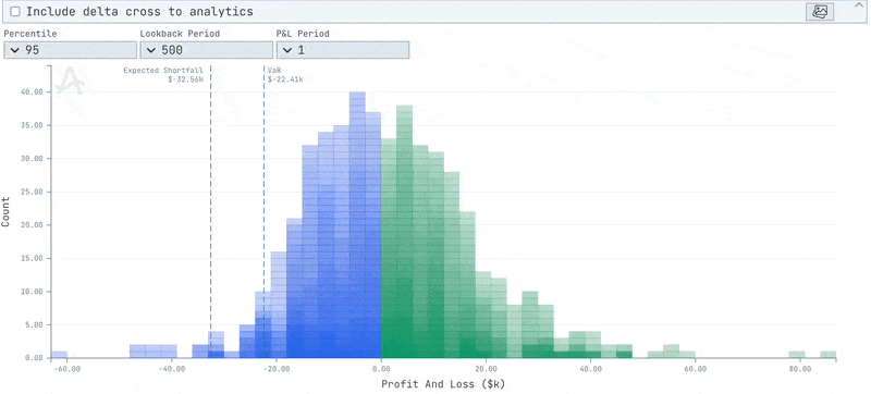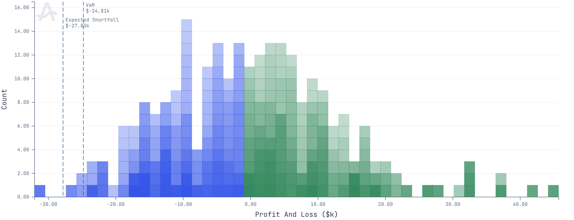 - Expected Shortfall Line: Indicates the mean loss of values worse than VaR (e.g., -$27.83k)
