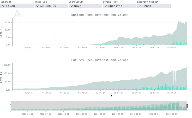 This dual-panel chart visualises the historical evolution of open interest (OI) and trading volume for both options and futures tied to a selected structure. It offers a clear lens into market activity, participant commitment, and liquidity growth over time.