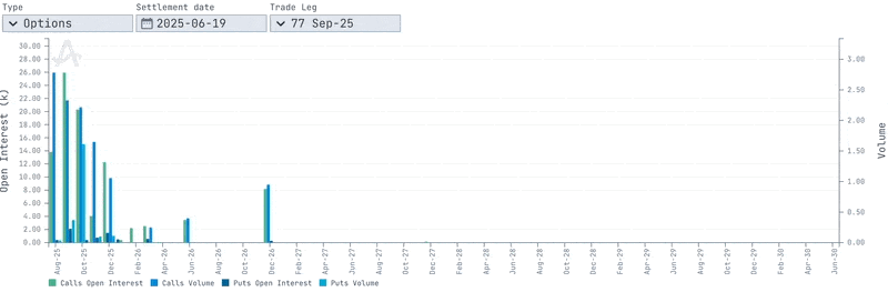 OI and Volume for entire curve for Brent Sep-25 77 Call