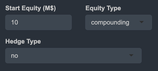 - Start Equity (M$): Define your starting capital, such as 10 for $10 million. This determines the notional size of trades.