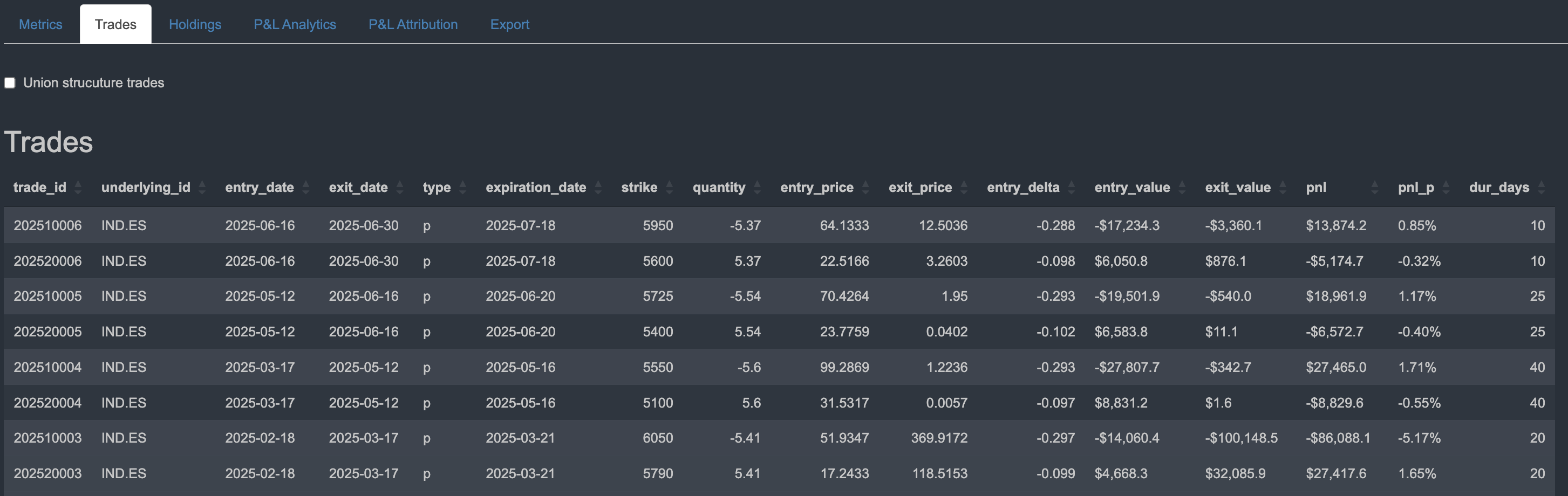 - Daily or monthly P&L attribution by leg, delta, or time decay