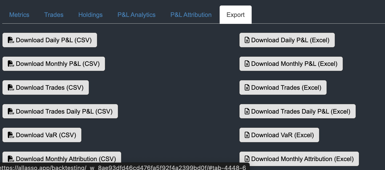 - 📤 Export all results and raw data (trades, holdings, analytics) for external analysis or reporting.