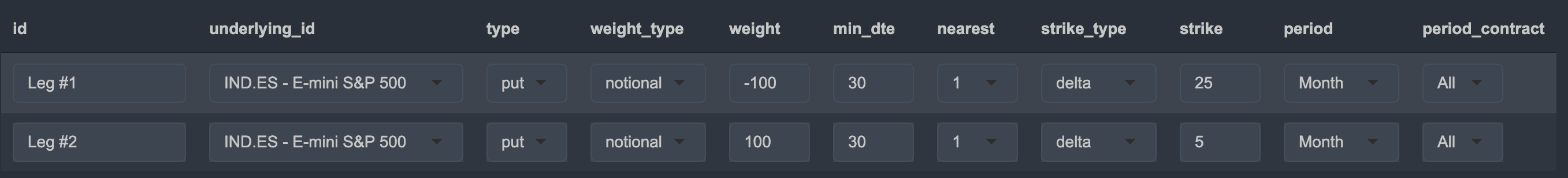 π Example: A 2-leg put spread might include a short 25-delta put and a long 5-delta put.