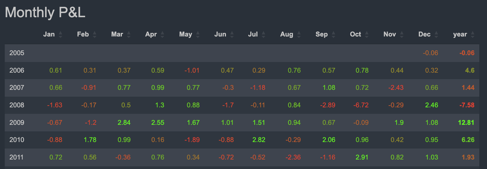 Below the summary metrics, youโll find a detailed Monthly P&L table, showing strategy returns by month and year.