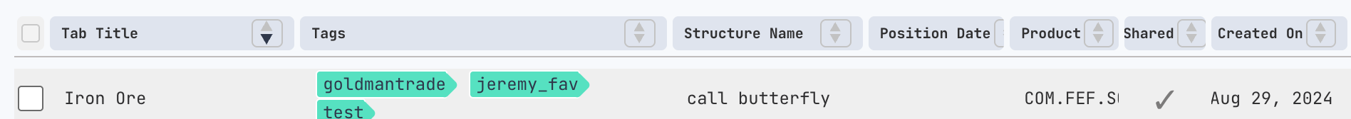 Each row represents a saved trade, including columns like:Tab Title: Name you assigned (or default βNew tabβ if unnamed)