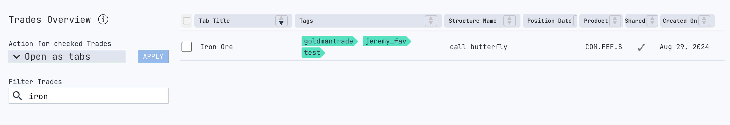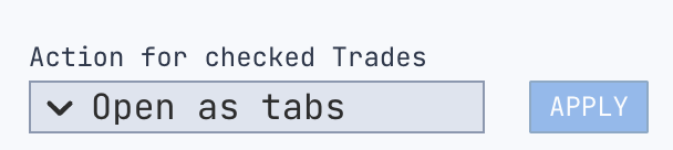 Select multiple trades using checkboxes and choose an action:Open as tabs: Load selected trades into the workspace as tabs