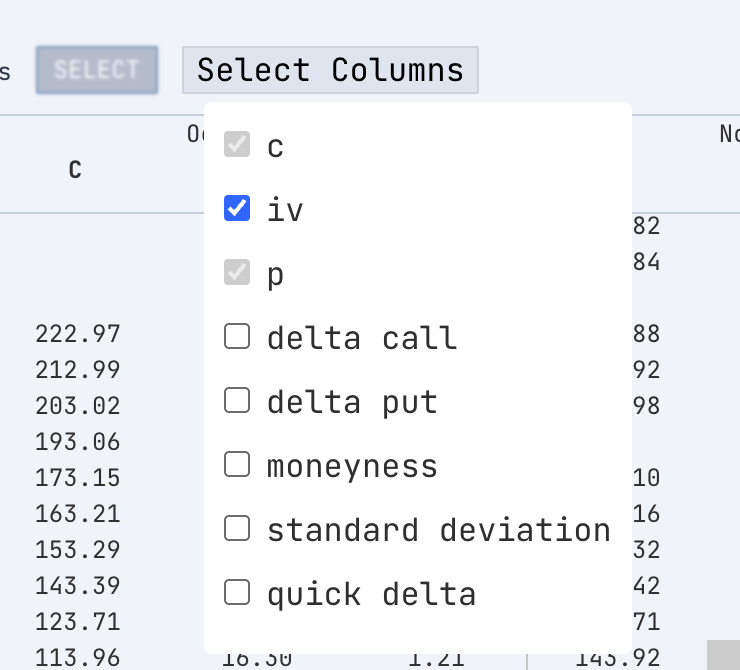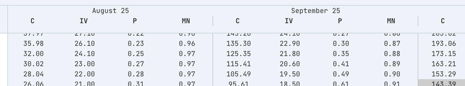 Once inside the Strike Map, you’ll see a grid of strike-related data organized by expiration dates and strike levels. The layout displays both Calls (C) and Puts (P) along with their corresponding values, including price, implied volatility, delta, and others.