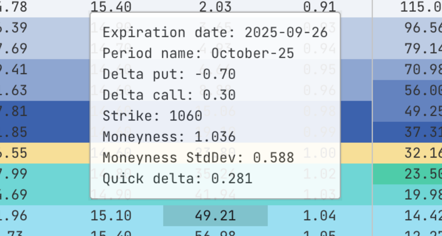 When exploring the strike map, hover your cursor over any option cell to instantly view a detailed tooltip. This pop-up includes all relevant information about the selected option: