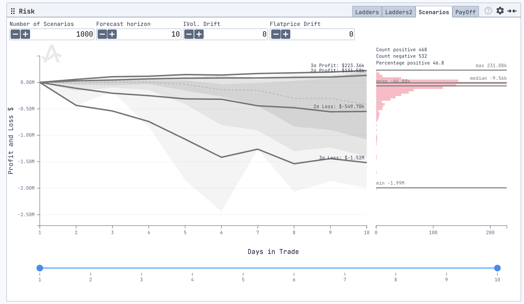 The Scenarios panel models a distribution of potential future P&L outcomes by sampling random historical market windows and projecting forward from todayโs state.