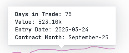 | Hover Cursor | Displays contextual trade data β including Days in Trade, P&L value, Entry Date, and Contract Month. |