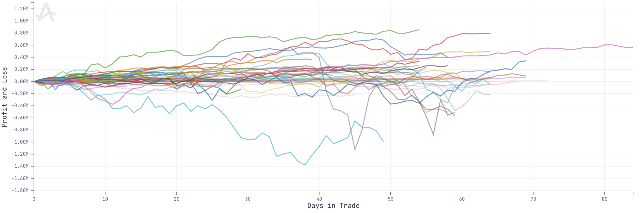 Horizontal Axis: Days in Trade β progression of each trade over its holding period.