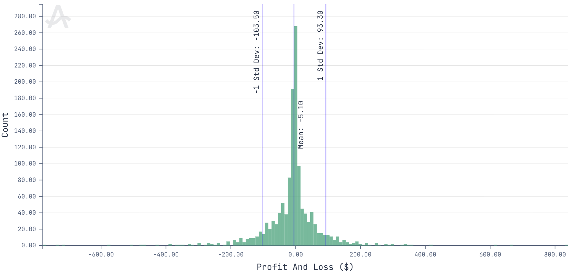 Each bar represents the frequency of a specific P&L value, allowing traders to quickly assess mean performance, volatility, and asymmetry in the backtest results.
